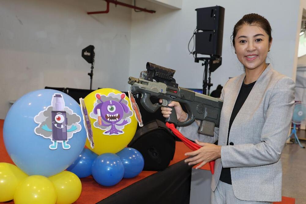 【記者陳良安南投報導】南投縣衛生局融入暑期青少年菸害防制主題, 6日在南投縣農工商會展中心,盛大舉辦「無菸槍霸戰」反、拒菸宣導嘉年華,鐳光槍戰、夜光尋寶兩大主題活動,吸引逾千位大小朋友親子報名,縣長許淑華也手持鐳光槍,與多位來賓共同擊破電子煙等菸怪造型氣球,擴大反菸、拒菸宣導效果,而豐富的比賽獎金、宣導品,更讓參加民眾健康玩得盡興的同時也收穫滿袋。