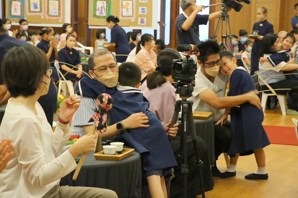 為讓畢業生孩童感念父母恩,大愛幼兒園畢業典禮特別安排畢業生孩童向父母親奉茶儀式,畢業生手捧拖盤,走到父母桌前恭敬奉上溫暖的茶,雙膝跪地頭頂禮,大聲唱出〈跪羊圖〉,小羊跪哺是孝親的展現,給雙親愛的擁抱,這是人間至真至美的畫面。