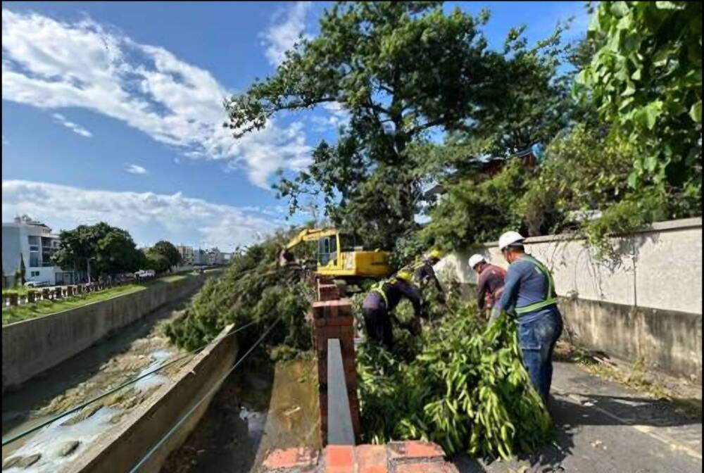 水利局指出,颱風期間洪水夾帶大量泥沙及垃圾沖入排水河道及滯洪池,狂風暴雨造成大量樹木倒伏及設施損壞;初步統計,水利局維管範圍內傾倒或斷裂樹木達2259株,園區燈具泡水損壞,淤塞待清理區域排水約25處,其中大樹區姑婆寮排水的淤塞河段有姑婆寮橋上下游及楠梓區牛食坑排水匯入典寶溪河段處橋墩卡阻垃圾等,以及曹公新圳水防道路樹倒影響通行。(圖文:記者于欽智)