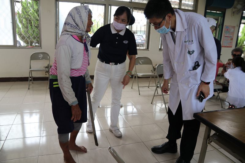 一位高齡83歲的阿嬤住著拐杖、打著赤腳前來,原來阿嬤的右小腿上有一個傷口,阿嬤說昨天就不小心撞到,今天因為颱風過後去巡田,不小心又去摳到同一處就流血了,又紅又腫又痛,聽到有義診由媳婦陪同前來看診,醫師即刻為阿嬤包紮,也開藥給阿嬤帶回家吃。