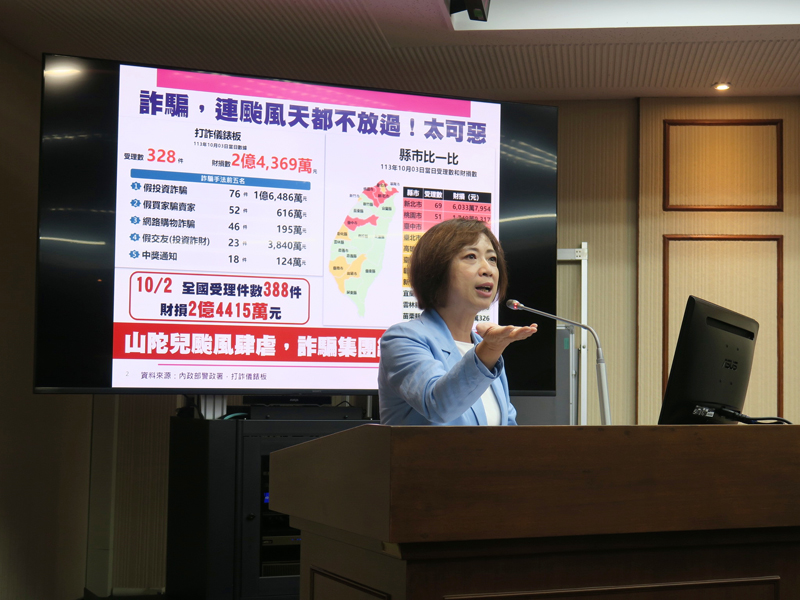 【記者林重鎣台中報導】民眾對於詐騙案件深惡痛絕,立法院交通委員會7日排定「我國打詐成效與防制」專題報告並質詢,立委何欣純首先指出,山陀兒颱風這月初肆虐台灣,各地方政府宣布放颱風假讓民眾避難防災,但根據「165全國防騙網」統計,10月2日、3日颱風天,全國仍傳出近700件、財損5億的詐騙案件,實在太可惡。
