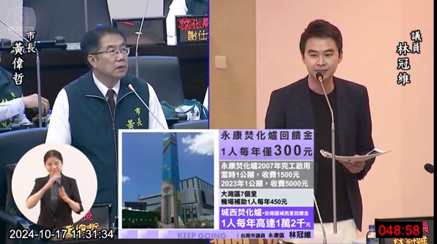 林冠維日前在市政總質詢時,率先感謝市長黃偉哲及市府團隊,協助他成功爭取永康焚化爐回饋金從原本每年300-1000元,將於明年增加為500-1200元。他說,永康焚化爐2007年營運初期的垃圾處理費是一公噸1500元,2023年一公噸是5000元,收費增加三倍以上,但周邊居民回饋金仍維持在營運初期的每人每年300元。這次終於獲得業者善意回應,林冠維希望市府能持續監督。