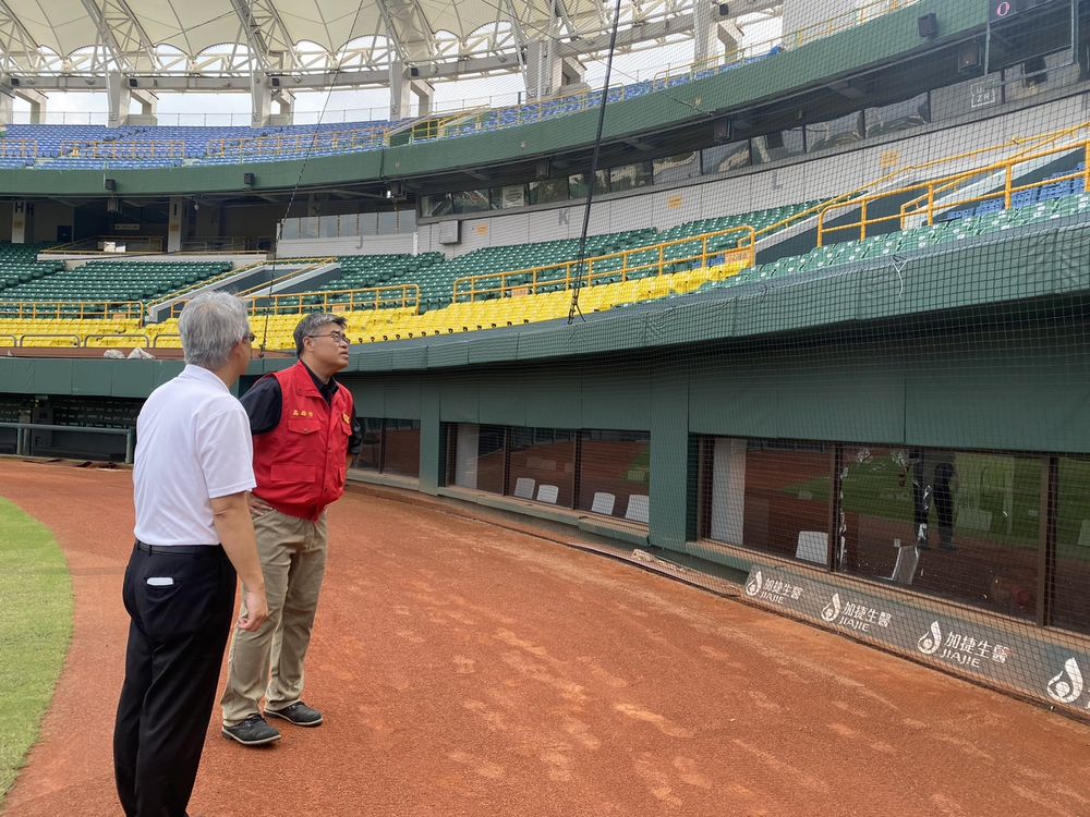 運發局表示,澄清湖棒球場前因山陀兒颱風受災,高市府全力排除障礙讓職棒賽事順利完成,面臨康芮颱風逼近,李懷仁30日視察球場後,指示增加沙包及加強鐵捲門固定。