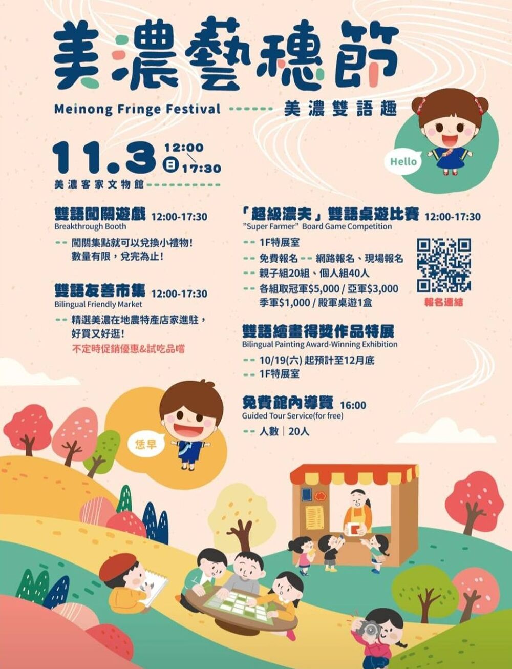 美濃藝穗節雙語市集11月3日在美濃客家文物館舉辦,以創意巧思讓參加的民眾有機會開口說客語及英語,並融入高雄客庒地區的人文特色,現場異業串聯客庄在地攤商,並搭配雙語活動,活動期間還能享有免門票進場以及館內導覽,更多活動詳情歡迎搜尋臉書「美濃客家文物館」查詢https://zh-tw.facebook.com/meinonghcc/。