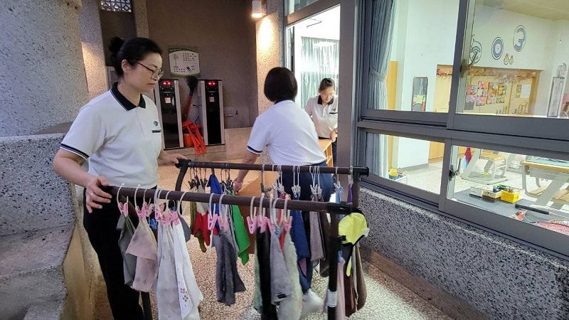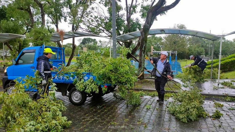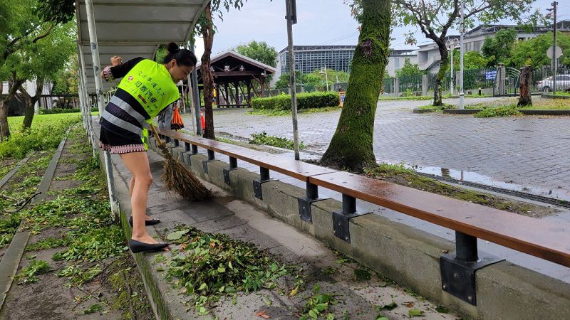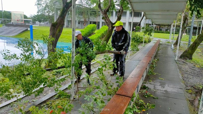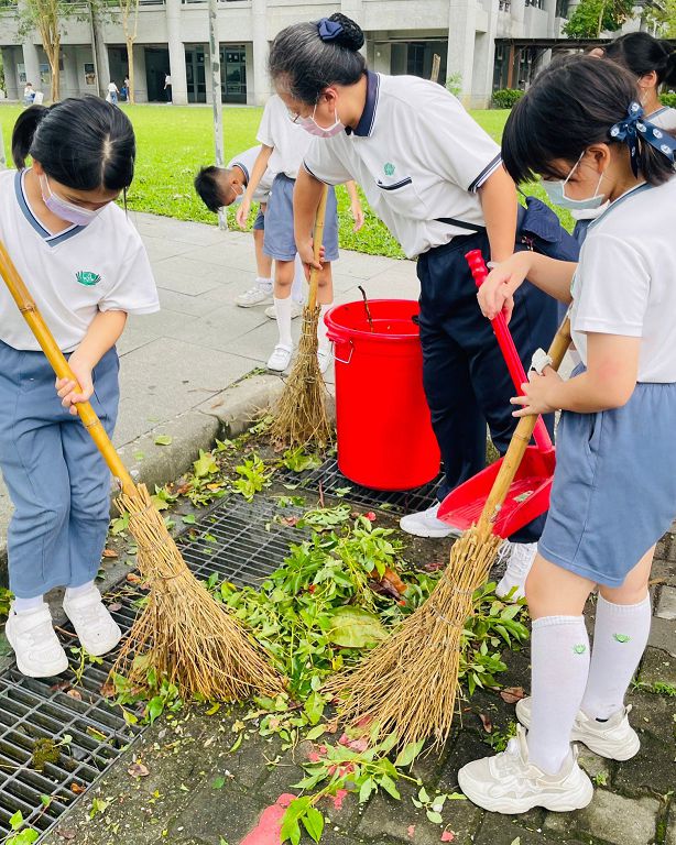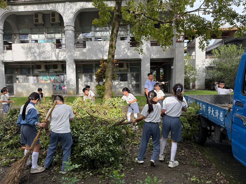 11月1日颱風過後,帶來的風沙、樹葉與雜物散布在校園的各個角落。清晨一到,各年級學生在老師的帶領下,分工合作,即使剛到學校還背著書包,學生皆自動地拿著掃把,井然有序地清理著校園的每一處。家長們也自願加入,與老師們一同搬運倒塌的樹枝,從操場到走廊,大家一同為校園的美麗盡一份心力。