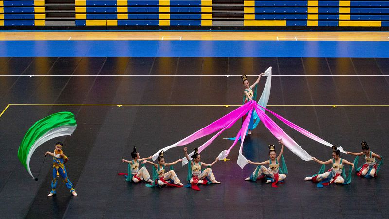 另一支國小B團體丙組古典舞《敦煌》,舞碼靈感源於唐代詩人對飛天仙女的生動描繪。舞者們以輕盈飄逸的舞姿,及手上揮灑的彩帶,詮釋了飛天仙女祥瑞之美,彷彿他們從九霄俯瞰人間,象徵著祥瑞與守護。孩子們透過細膩的手部動作與優雅的身體線條將飛天的靈動栩栩如生地重現,對於小學生來說,這樣的表現可謂是一項難得的成就。