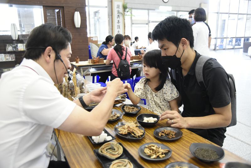 大林慈院疼痛治療科王思讚醫師,帶著五歲的女兒來到「養生茶飲」這主題館,許開興理事長介紹各種中藥材,將蠶絲套在小女孩的小手指上把玩的開心。王思讚醫師表示,看到這些大自然的東西竟然都能當成藥材,真的很神奇。一般西醫在胃食道逆流的治療上會使用胃酸抑制劑,而由烏賊的骨狀內殼洗淨,乾燥而成中藥材海螵蛸,竟然能治療胃食道逆流,開了眼界。