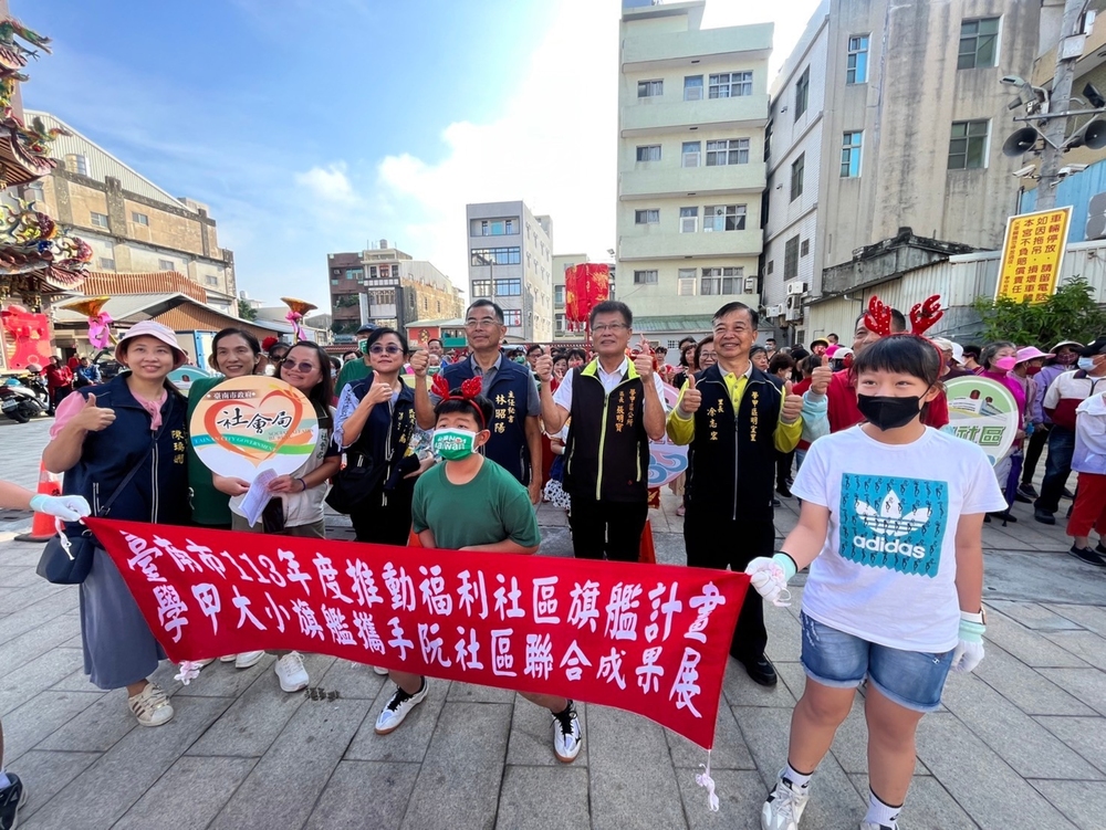 【記者鄭永德台南報導】為落實市長黃偉哲打造幸福深耕社區的施政理念,臺南市政府社會局結合學甲區公所,輔導新榮社區發展協會攜手美豐社區、平東社區、宜民社區、西明社區推動「113年福利社區化旗艦型計畫─同心、攜手、學甲平安─幸福居」,並於9日隨著社區的擊鼓樂聲及舞蹈遊行表演啟動學甲區大小旗艦聯合成果展,社會局盧禹璁局長親自出席,學甲區長張明寶、立法委員陳亭妃、巿議員蔡蘇秋金、蔡秋蘭、謝舒凡本人,立法委員林俊憲、巿議員陳昆和、方一峰等服務處代表、學甲仁得、平西、大灣等社區理事長、平和里、秀昌里長及希望義剪協會均到場參與。