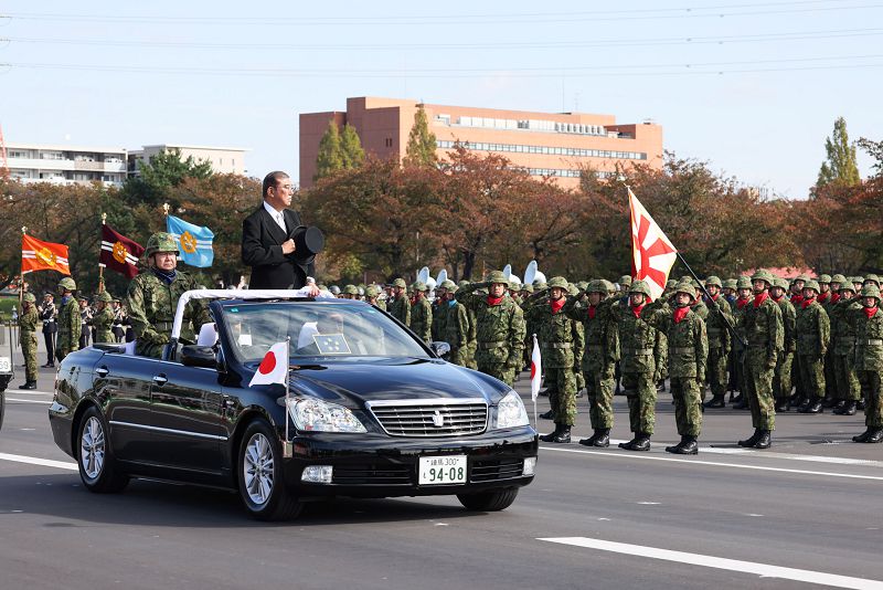 日本自衛隊觀閱式由陸海空自衛隊輪流舉辦,今年紀念自衛隊成立70週年,是陸上自衛隊時隔3年舉辦觀閱式。日本防衛大臣中谷元也出席。日本自衛隊今天出動約10輛戰車、裝甲車,約40輛卡車等,以及約10架直升機、戰機等。陸上自衛隊首度出動UH-2直升機、海上自衛隊出動P-1反潛機、航空自衛隊出動最先進的F-35A匿蹤戰機及F-2、F-15戰機等。