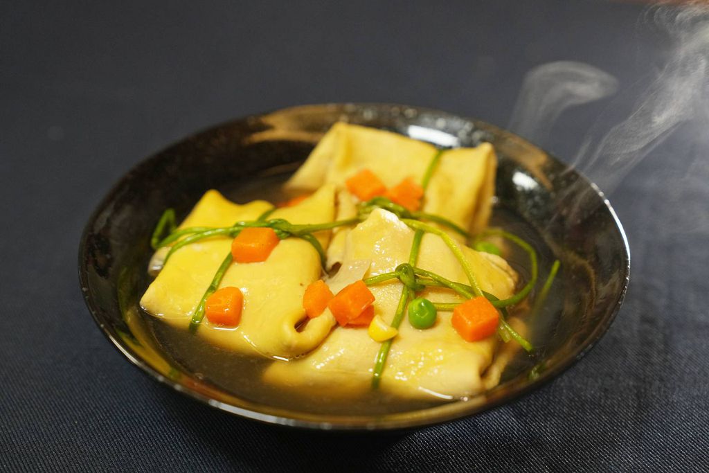 「黃金福袋」每顆熱量約89.8大卡,使用天然食材,無其他添加物,富有飽足感,再搭配淨斯本草飲烹煮的藥膳湯,對這群長輩最大的歡喜除了午餐加菜,營養師團隊也希望長輩在初冬感受到滿滿的溫暖。
