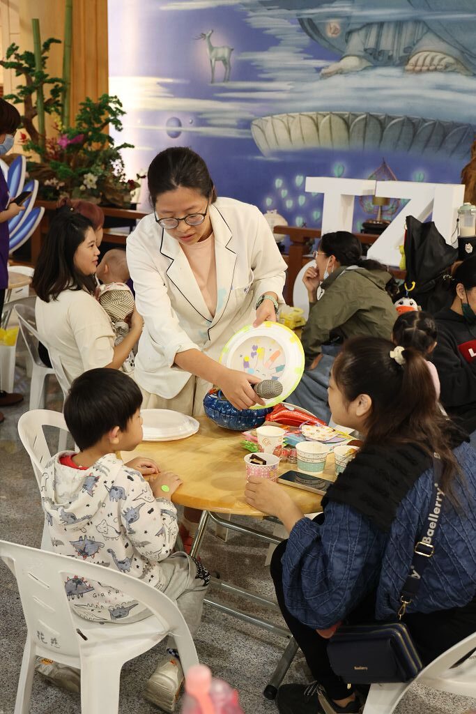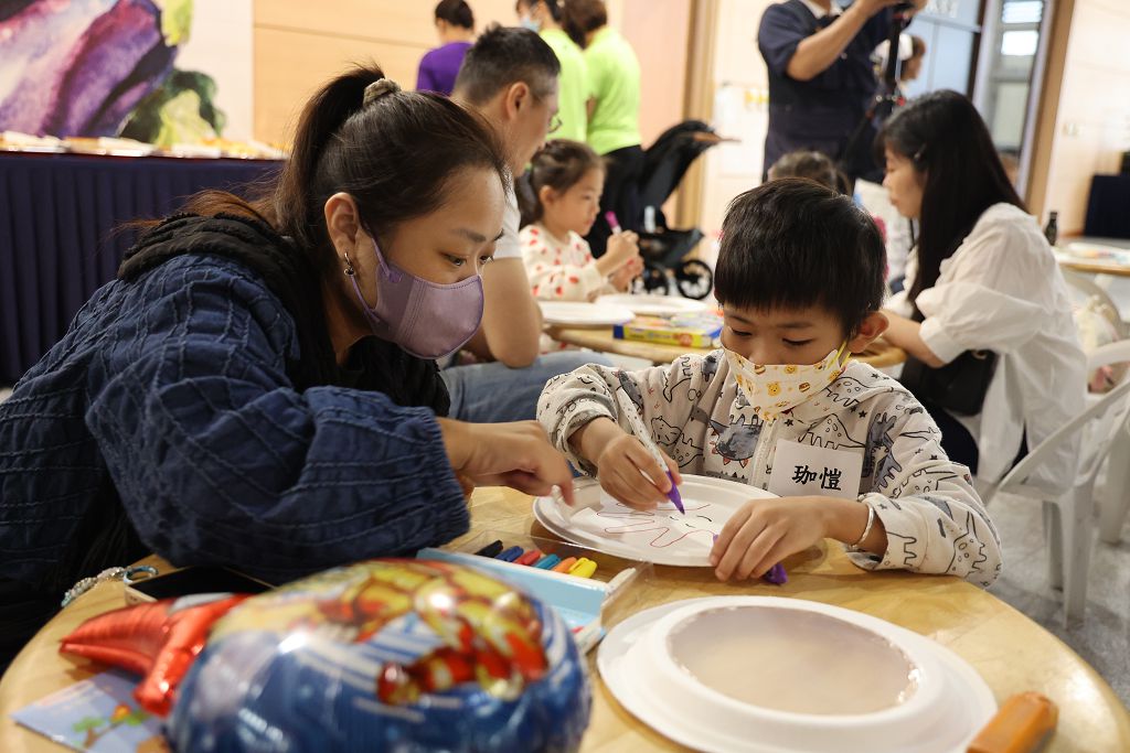 在藝術饗宴中,在治療師劉家妤的引導下,爸爸媽媽帶著孩子用兩個盤子一起作海浪鼓,先在一面盤子上用彩筆記錄孩子的手掌大小之後,將小鈴鐺、香香豆、米、綠豆放進盤內,再將另一面透明的盤子合訂為一個鼓,搖起來就可以聽到沙沙的海浪聲。劉家妤說,這是一個結合視覺、聽覺、嗅覺、觸覺的手作遊戲。海浪鼓的表面是透明的,小朋友也可以練習眼睛的追視。