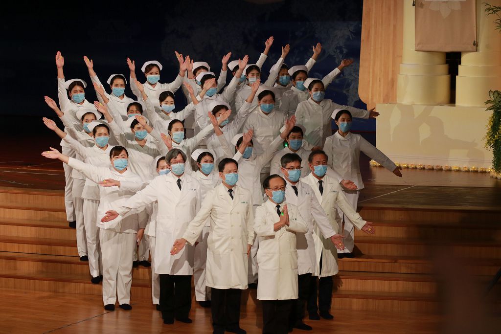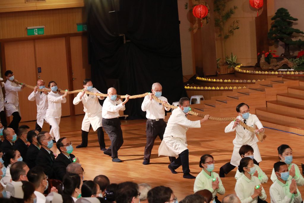 歲末祝福是慈濟醫療體系特別的活動,醫院同仁透過經藏演譯,展現拔苦與樂、守護生命願力。台中慈院醫護同仁外,還有沙鹿光田醫院院長陳子勇、竹山秀傳醫院榮譽院長謝輝龍,以及慈濟中區人醫會召集人紀邦杰醫師近計七十位醫護同仁,共同演繹無量義經德行品與法華經藥草喻品,呈現慈濟法脈的長情大愛,法海區醫護同仁與各慈濟功能組慈濟人整齊畫一呼應演繹。簡守信院長以拉縴苦行表達醫護人員拔苦救難精神,並帶領全體與會人員發願要深植醫病情、扛起醫療使命、深入慈濟精神。