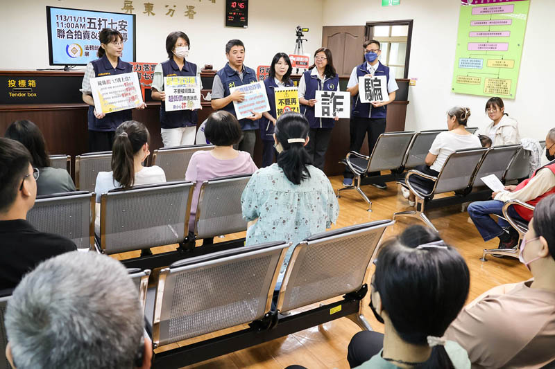 上午11點辦理「五打七安聯合拍賣會」,拍賣會開始前,屏東縣警局刑警大隊葉璟昌組長以活潑有趣的生活案例向在場民眾宣導反詐,分署人事室兼辦政風人員則進行有獎徵答宣傳打詐,再由柯怡如分署長敲下法槌,宣布拍賣會開始。