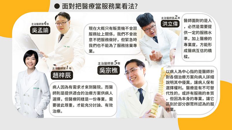 「熱血YOUNG醫——系列報導」由台北慈濟醫院公共傳播室廖唯晴、鄭冉曦、張家慈與盧義泓共同完成。廖唯晴表示:「本次團隊特別專訪台北慈濟醫院內、外、婦、兒、急共12位專科年輕醫師,分享從進入醫學系的初衷到走入臨床所面臨的挑戰,以及在醫療大環境變遷衝擊下,如何在職場與生活中取得平衡。」文中提及有年輕外科醫師立志在繁忙的醫學中心服務,以獲得更多手術實作的經驗;也有年輕的急診醫師不自限於在急診室搶救病人,而利用週末假日深入鄰里為遊民義診;更有年輕的內科醫師投入教學研究之列,用創新多元的方式培育新進醫療人員。此系列報導透過文字與活潑有趣的照片插圖,充分呈現醫師們在職場上的熱情、自信、失落與內省,展現新世代價值觀,並鼓勵年輕醫師們在搶救生命的同時,也勿忘學醫初心,只要在團隊中找到定位,全力以赴,YOUNG醫師同樣能發光發熱。