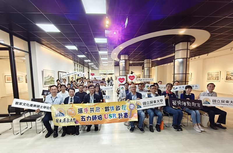 【記者范家豪屏東報導】國立屏東大學在師資培育及藝術教育司的「師培USR」計畫支持下,由師資培育中心與視覺藝術學系、客家文化產業碩士學位學程合作,於11月14日於屏師校區藝文中心辦理「師培USR藝術教育」論壇,並以「藝術擾動教育:屏東在地藝術創作展」為題,邀請教育美學學者李崗教授、藝術創作者黃冬富教授、屏東在地藝術學校校長鍾秀鳳,及民間藝術教育工作者蔡佩伶執行長,分享與「生活美學與教育」相關議題的看法。
