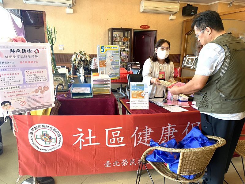 北榮桃園分院楊斯年副院長率領社區醫學部護理師,為現場民眾免費提供量測血壓血糖及肺癌篩檢等相關健康諮詢,並親自上台介紹有關金字塔三級醫療服務計畫及該院為榮民、榮眷提供之各項綠色通道服務,並闡述醫院未來發展方向。