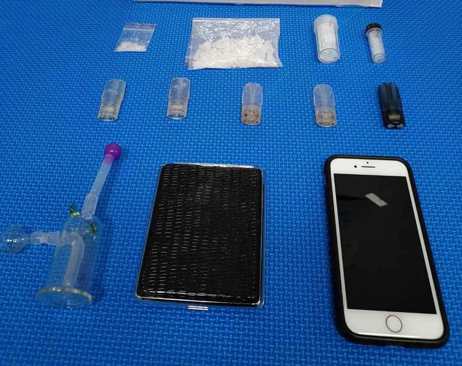 林姓男子在十四日晚間駕駛一輛自小客車違停於太平區育才路上,適中市警局保大第一中隊幹員執行巡邏勤務發現,立即進行稽查盤檢,赫然在車內查獲到陳姓男子為臺中地方法院發佈的加重詐欺通緝犯,隨即將陳男逮捕並依法搜索;警方驚見車內有一組安非他命吸食器,另在駕駛林姓男子身上查獲二級毒品安非他命一包、麻醉煙彈五顆、愷他命一批及K盤一個,於是將二人帶回隊部調查,林姓男子坦承持有及吸食毒品,警訊後先將陳嫌解送歸案外,另依毒品危害防制條例罪嫌將林男移送法辦。(記者廖本福翻攝)