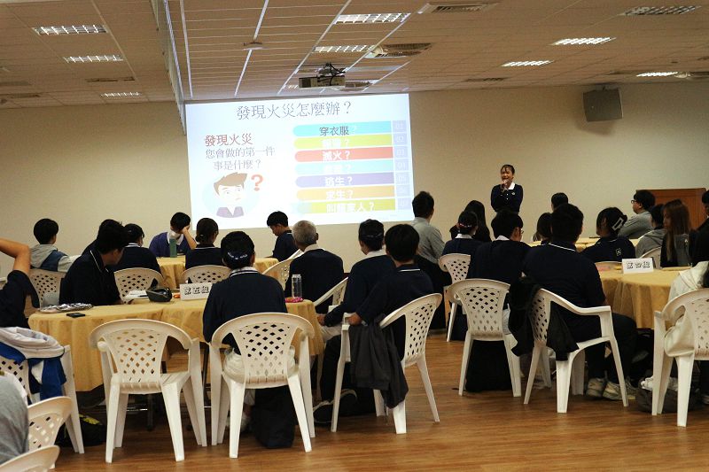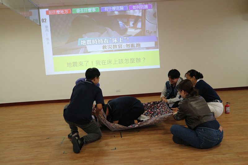 上午課程的最後是進行實際情境演練,包含地震來時基本的防護動作、睡覺時發生地震、洗澡時發生地震、大賣場發生火災時該如何進行避難逃生等等的情境,邀請各組同學上台進行實際模擬演練。