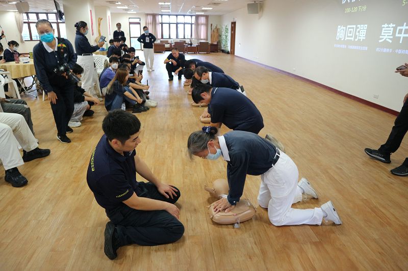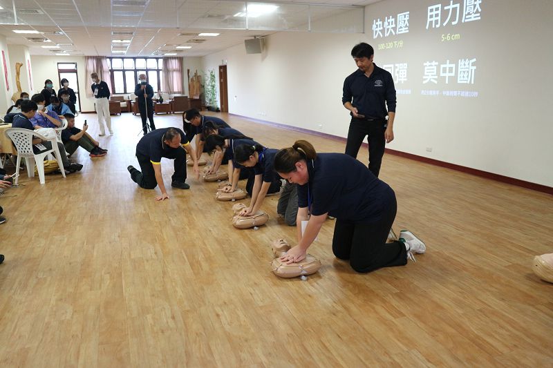 下午課程則是由八德消防分隊小隊長楊忠彥及兩位消防弟兄前來擔任教官為同學們講解CPR的相關知識及實際執行步驟,楊小隊長表示,當一個人停止呼吸,4分鐘之後腦部就會受到損傷,經過正確CPR的施行可以延緩腦部受傷。