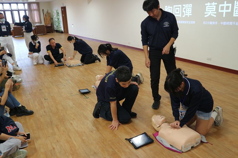 接著以安妮模型進行CPR的實際執行方式,搭配「叫叫壓電」口訣,讓同學們更容易了解執行步驟及正確的姿勢,之後就是下午課程的實作時間,除了有迷你安妮模型,讓同學們練習正確的姿勢、手法外,第二階段,教官們準備了可以連接平板的安妮模型讓同學來練習,可以在第一時間從平板畫面裡知道自己的姿勢正不正確,能隨時進行調整。