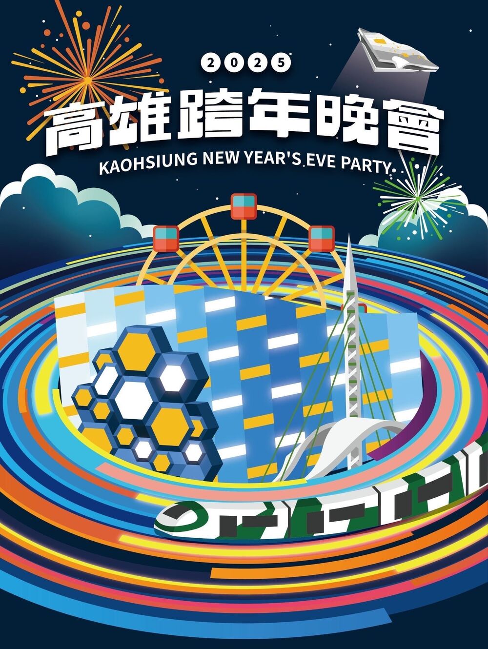 2025高雄夢時代跨年晚會以「亞灣星海奇航」奇幻未來風為主題,色彩鮮明的圓盤交錯旋轉,環繞高雄地標性建築:高雄流行音樂中心、大港橋、夢時代,衛武營建築更化身可愛幽浮,動感且充滿衝擊力的視覺效果,展現高雄從亞灣航向銀河系的狂飆能量,繽紛且充滿想像力的構圖,符合跨年節目的酷炫風格,更展露活力高雄迎接新年的喜悅。
