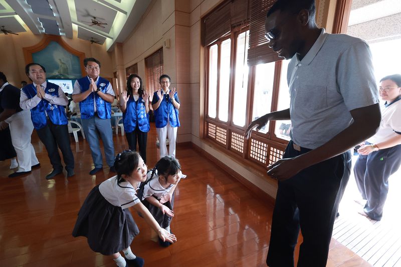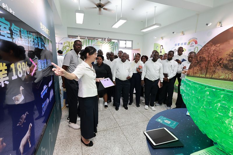 參訪行程重點還包含環保教育基地的參訪,大家忙著拍照記錄,不斷讚嘆科技融入體驗教育值得學習。臺南慈小的學生們以流利英文導覽,展現自信與禮貌,條理分明地介紹校內環保措施,還主動學習葡萄牙語,牽起莫三比克校長與老師的手熱情互動,讓來賓笑容洋溢。