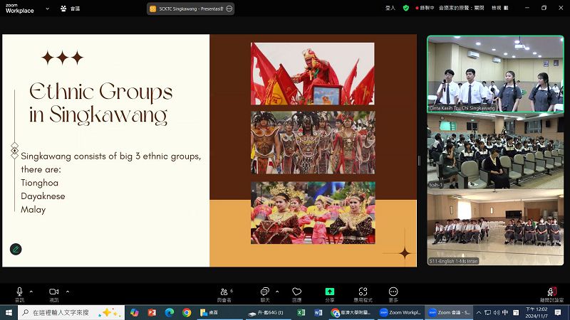 學習不受距離限制!十一月七日慈濟大學附屬高級中學與印尼金卡蓮慈濟大愛學校及山口洋慈濟大愛學校舉辦跨國三校視訊交流。各校高一的同學共聚於雲端,探討臺印兩國多元文化,同學們以流利的中英文分享多元族群及傳統特色,讓彼此瞭解不同的文化,拓展國際視野,學習不再侷限於教室,而是跨越了二千八百多公里的距離。