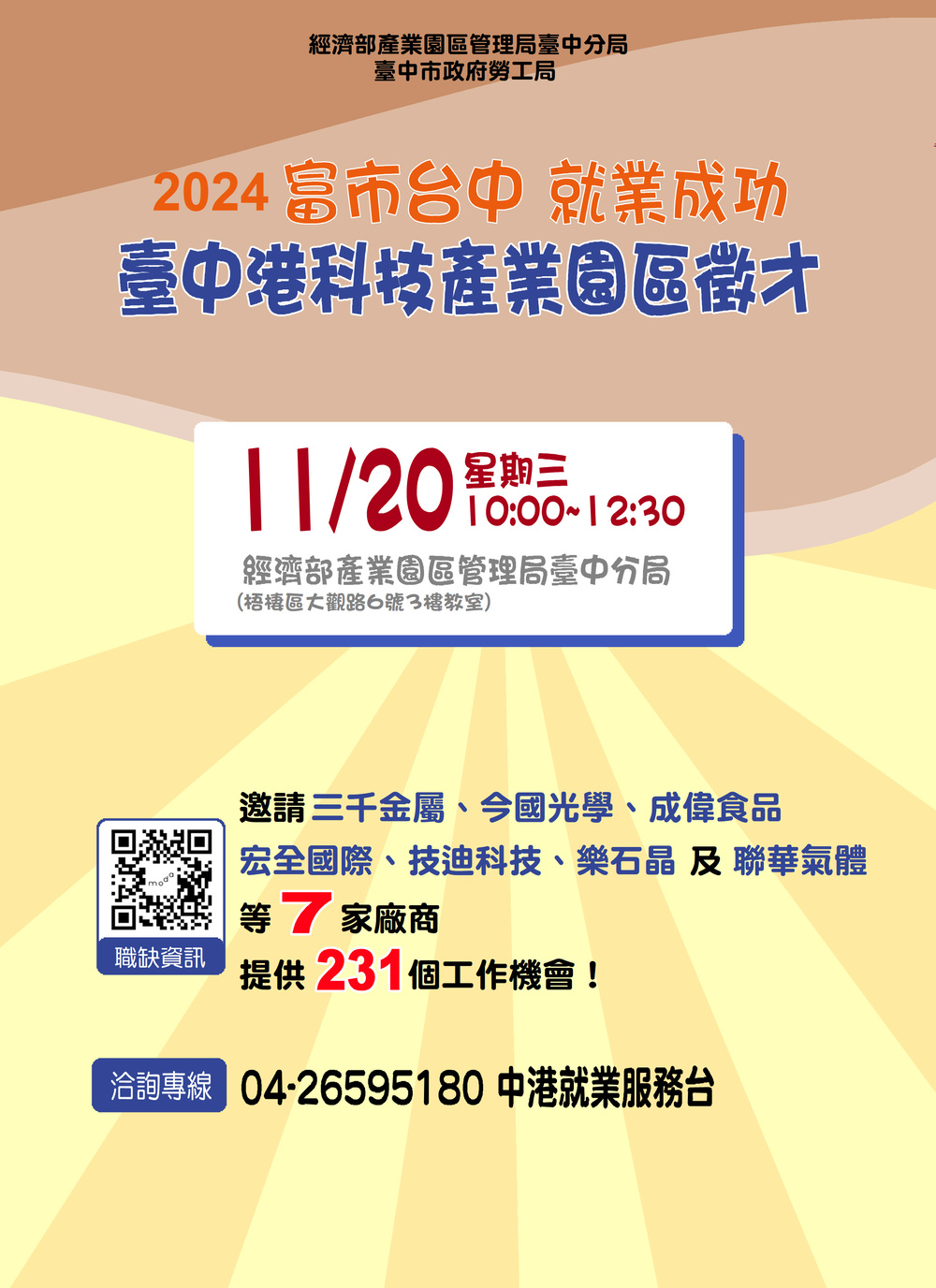 歡迎想求職或想轉職的民眾,把握這次與雇主面對面應徵的機會,增加錄取機率,現場前50位求職者將致贈精美紀念品,若無法親自前來現場的民眾,可利用產業園區管理局臺中分局官網(https://www.bip.gov.tw/harbor/list.aspx?pageid=b59c2814513a3a5a)「就業訊息」查詢,或洽本活動承辦人:04-26581215分機646黃先生、台中市沙鹿就業服務站中港就業服務台04-26595180曾小姐。