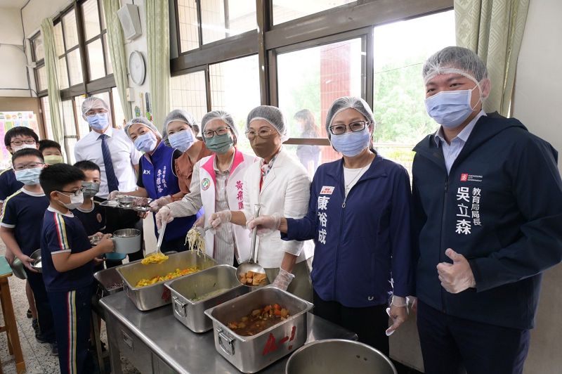【記者于欽智高雄報導】為讓高雄孩子吃得健康、快樂成長,議長康裕成特偕同教育委員會議員前往三民國小關心學童營養午餐;康議長與議員更全副武裝,穿戴防塵帽與手套,親自為學童打菜,色香味俱全的餐點讓小朋友直呼好吃!