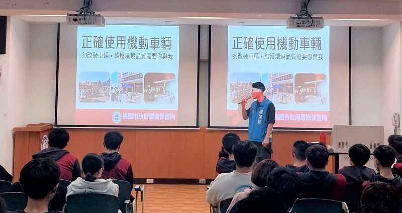 環保局近日屢次接獲民眾陳情噪音車於校園周圍地區,常有學生車輛不當變更排氣管或其他機件於道路上行駛,影響學校附近社區住戶安寧及造成噪音問題。為宣導校內師生勿違法改裝車輛造成噪音污染影響生活環境品質,端正青少年及學生維護環境安寧觀念。環保局、警察局於11月13日及14日,分別前往龜山區世紀綠能工商及楊梅區新生醫校合作執行校園教育宣導,宣導如何正確使用機動車輛,內容包含法令宣導、靜桃管制措施和執行成果、排氣管自主認證檢驗措施等議題,宣導過程並帶入實際發生案例、相關新聞媒體報導文章和影片,師生也表示此宣導有助於瞭解相關噪音政策及措施。