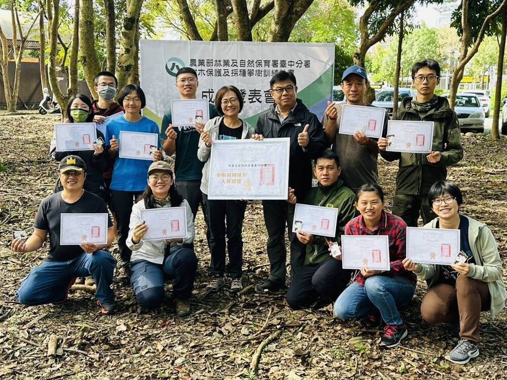 【記者張原銘、張皓傑台中報導】為加強人員於森林樹冠層從事林木採種及自然保育等作業的安全,林業及自然保育署臺中分署辦理為期30小時的攀樹技能訓練,共有12位林業人員訓後通過專業知識及技術測驗取得攀樹證照,23日於東勢林業文化園區舉辦「樹木保護及採種攀樹訓練計畫」成果發表會,頒發結業證書及授證儀式。當日更展示了攀樹採種裝備及工作照片等成果,並結合現場攀樹體驗,讓民眾更了解樹冠層工作的樣態。