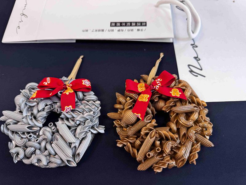 為了讓家屬達到舒壓與喘息,輕安居還特地邀請「手癢,就作」工作坊的文美琳老師,現場教大家使用生活中隨手可得的素材做耶誕花圈。材料包括紙箱、義大利麵、蝴蝶結、噴漆等。首先將回收的紙箱剪一小片圓形,中間挖洞,接著再把各種不同形狀的義大利麵用白膠黏上,待白膠乾了之後噴漆,最後黏上蝴蝶結,穿上吊掛紙線即可完成。