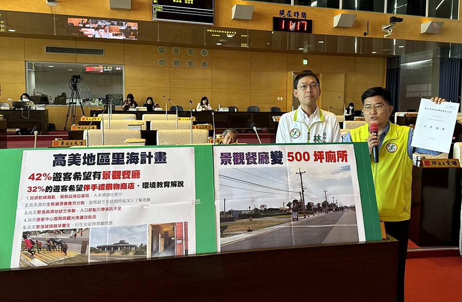 台中市議會進行市政總質詢,市議員楊典忠、林祈烽、施志昌、鄭功進針對高美濕地捨景觀餐廳,卻蓋500坪廁所提出質詢,楊典忠表示,高美濕地附近沒有景觀餐廳、美食街,今年初市府卻取消高美濕地景觀餐廳規劃費,然後動支經發局第一預備金117萬9000元,要在原景觀餐廳的地方蓋公共廁所,都發局里海計畫對遊客進行問卷,有42%的遊客希望有景觀餐廳,32%的遊客希望有伴手禮購物商店、環境教育解說,議員質疑市府的政策未顧及遊客需求,而且只有設計費,114年預算沒編工程費,議員也質疑「會不會過完年,高美濕地廁所又說不蓋了」?