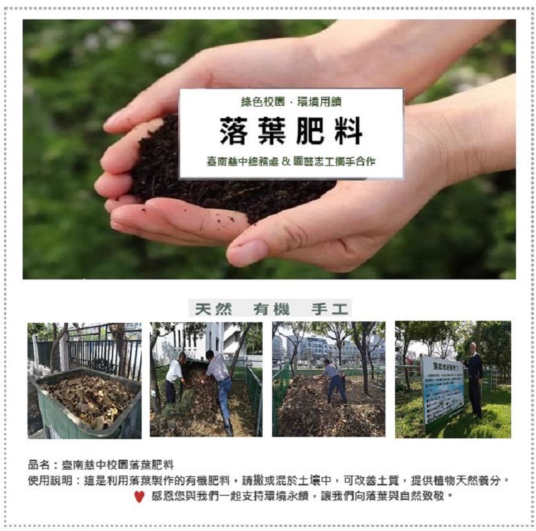 今年學校獲得臺南市環保局設置落葉推肥場域補助後,於九月完成設置校園落葉推肥區,落葉推肥實施成果將展示於本周六校慶愛心園遊會–園藝志工攤位上每包愛心環保有機沃土,透過落葉推肥增加土壤的有機碳含量。多園「增匯」具體行動由教職同仁與各部學生從議題探究進而逐步發展出的行動路徑,讓臺南慈中環境教育的行動策略在教育實踐與教學深化能更扎實地朝目標邁進。