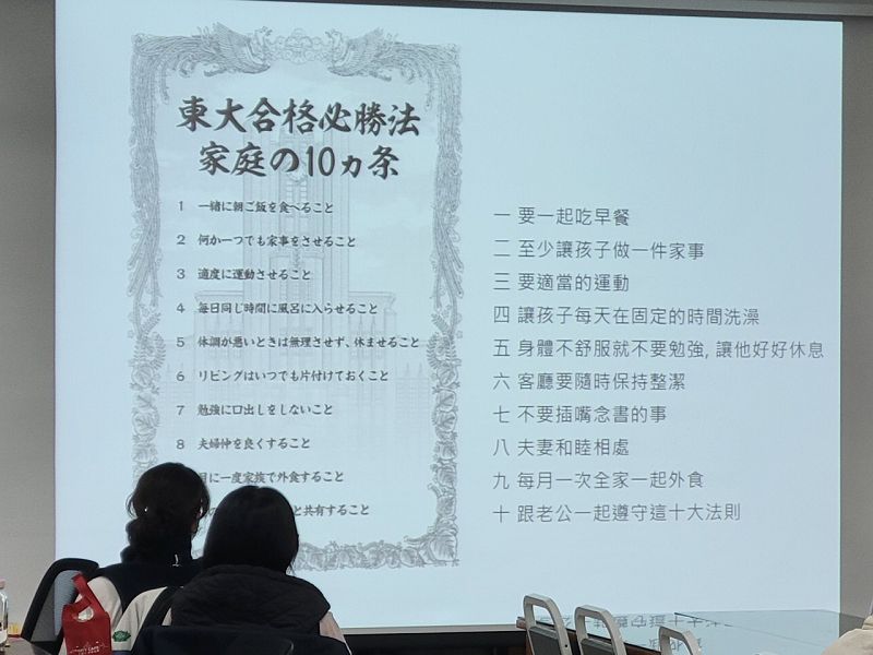 他也強調自主學習與生活管理的重要性,以家事為例來說明,如何透過設定明確的生活作息流程,例如「回家拖鞋、洗手、喝水、完成作業、協助家事、閱讀」等,逐步訓練孩子的生活自理能力。家長應適度分配家事,根據孩子的年齡逐漸增加家事項目,三年級可負責兩件,六年級可挑戰五件家事等,讓孩子在參與中體會責任感與成就感。