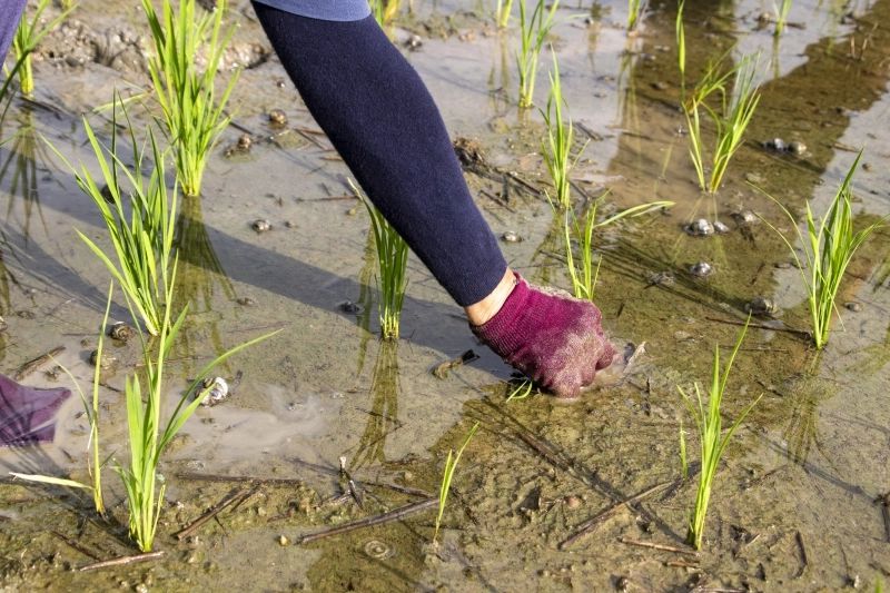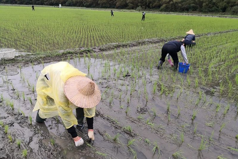 看到秧苗間有幾處空隙,師伯熟練地拔起旁邊較密的一撮秧苗,分插進土裡,我趕緊請師伯教我如何插秧。師伯二話不說,遞給我一撮大約七八棵的秧苗,指導我挖個洞插進去,再把周圍的泥土撥過來,壓一壓,讓秧苗站穩。