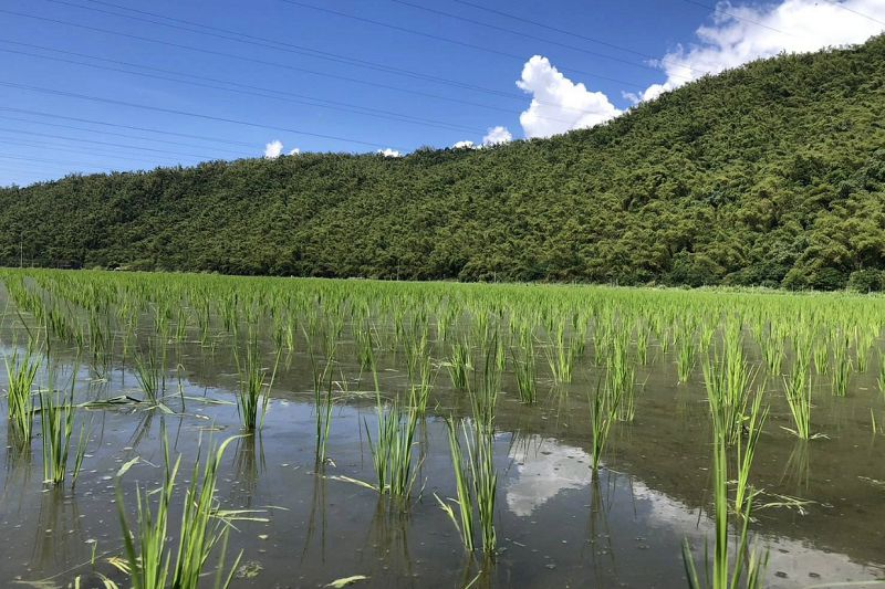 綠油油的秧苗在風中搖曳,藍天白雲映襯著青山,構成一幅迷人的美景。(攝影周怡吟)