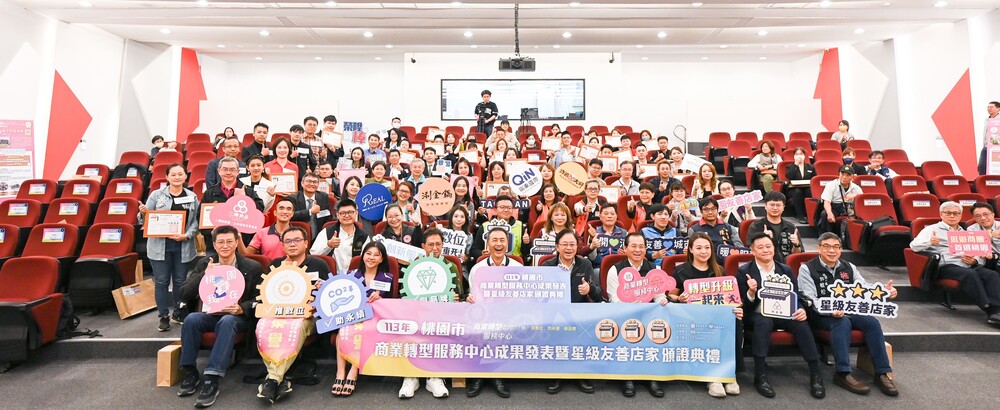 【記者徐玉英桃園報導】桃園市長張善政日前在立法委員萬美玲、市議員張曉昀、市府經濟發展局長張誠、社會局長陳寶民、桃園區長許敏松、中衛發展中心中區服務處長王世昌、桃園市商圈產業聯合會總會長王根深、桃園市藝文特區商圈發展協會理事長李秀鈴、桃園市博愛特區文創商業發展協會理事長蘇美樺、站前商圈文化觀光發展協會理事長廖敏榮、桃園車站商圈協會理事長楊慧青、健行商圈發展協會資訊長邱奕君、八德觀光商圈促進會理事長王錫文、中壢車站商圈發展協會理事長范美惠、恆器製酒公司創辦人羅己能、天下國際事業公司負責人黃靜嫺、三陽食品公司負責人謝東良、揚秦國際企業公司品牌經理黃姵嘉、益瑞昇國際業務經理吳欣穎、大湳形象商圈總幹事張坤良及龍華科技大學觀光休閒系副教授胡光復等人陪同下,前往桃園市政府綜合會議廳出席「桃園市商業轉型服務中心成果發表暨星級友善店家頒證典禮」。