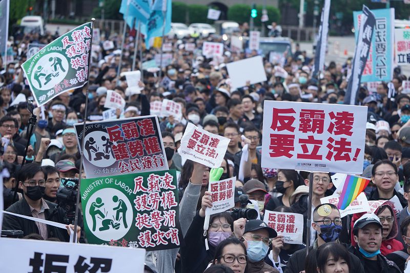 民眾黨舉行「反霸凌,護勞權」大遊行,多名黨公職與會團體身穿黑衣、繫上白絲帶,7日下午1時30分先在勞動部前集結並進行短講,訴求制定反霸凌專法、警消籌組工會、保護吹哨者。全國公務人員協會理事長高誓男表示,勞動部11月有一名優秀的公務人員在不當管理下走向輕生,後續各機關公部門也接二連三發生很多霸凌事件,顯示現在公務機關不當管理、霸凌問題嚴重,且根據立法院預算中心研究報告,去年就有11名公務員輕生、1300多人辭職,較2022年各增加120%跟122%。