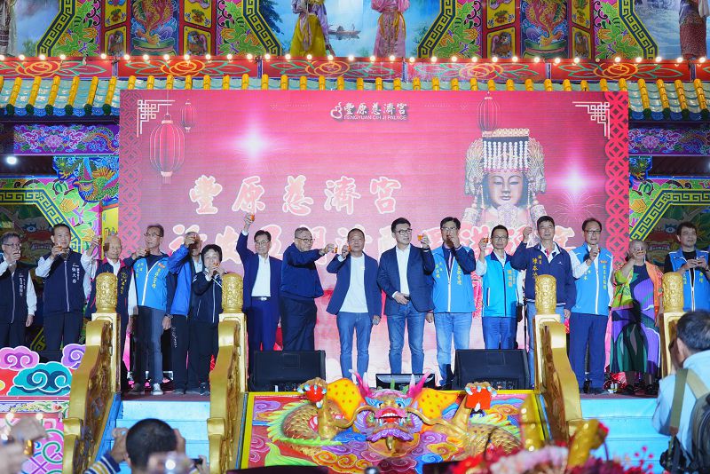 【記者彭勝郎台中報導】建廟迄今逾三百年的豐原慈濟宮,今年迎來百年建醮大典從11月16日恭請建醮神、11月24日展開為期7天的醮典,11月30日歷經莊嚴隆重的普渡法會及跳鍾馗等科儀後圓滿落幕,7晚在東區三官壇醮壇舉辦圓醮福宴與各友宮及信眾分享喜悅,現場席開近600桌,場面盛大熱鬧。台中市政府副秘書長張大春代表市長盧秀燕出席活動表示,感謝廟方慈悲濟世,長期護佑鄉里,祝福慈濟宮香火持續鼎盛、信徒滿天下。
