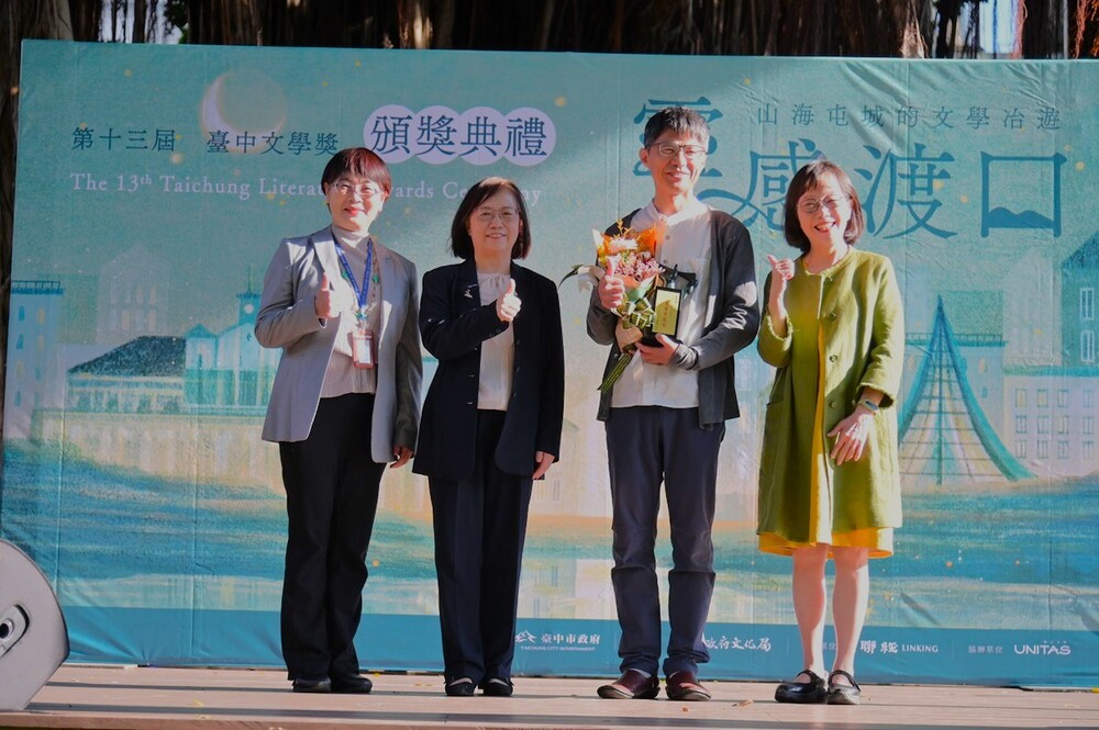 今年文學貢獻獎得主甘耀明老師表示,他與臺中的淵源從1990年代在東海大學就讀,便種下文學夢想的種子,在師長的陪伴下走過了一段青澀的創作時期,在臺中這塊充滿明媚的陽光與溫度的城市氛圍中,找到了安頓與安身立命的幸福之地,特別感謝評審及臺中市政府的肯定,讓他榮獲了文學貢獻獎。