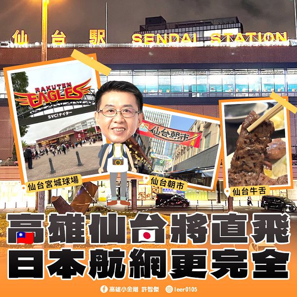 【記者李鳴盛高雄報導】航空立委許智傑委員12/9宣布日本仙台全新航線,預計明年10月底首次開航。許智傑發文感謝泰國獅子航空全力支持高雄-仙台航線,並排除地勤人力、油料不足等諸多難關。經過近半年的努力,終於取得油料,傳來開航的好消息。許智傑強調,未來南臺灣的國人可以規劃從日本東北到北海道的開口式旅遊,對遊程規劃更加方便,同時也可望吸引更多日本遊客來高雄。