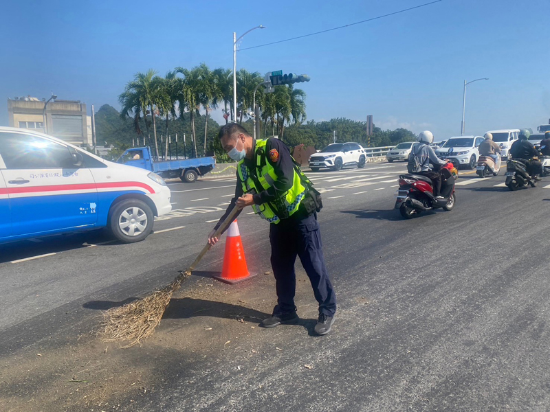 高雄市旗山區中華路與延平一路口路面,疑似有車輛洩漏的大量油漬,因位屬交通要道且車水馬龍,讓來往汽機車輛左閃右躲,駕駛膽戰心驚,情況險象環生;建國派出所巡佐黃見成、警員鄭玉杰巡邏時發現,立即將警車停放於路口明顯位置,並擺放三角錐警示及指揮疏導交通,還電告環保局清潔單位協助處理;由於員警擔心機車騎士滑倒引發事故,馬上向當地百姓借掃帚、畚斗先行處理,經與後到的清潔隊員通力合力半個多小時,總算讓路面恢復如常,確保了交通安全與順暢。(圖文:記者于欽智)