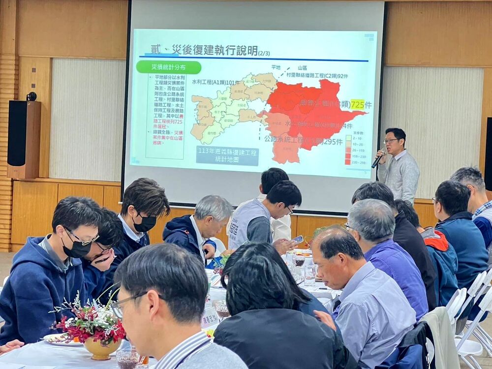 簡報指出,今年災害特別多且集中於下半年度,目前多數工程正辦理設計或發包作業。陳政委表示,除應加速推進採購發包進程外,可由縣府出面協調,加以整合各鄉鎮公所資源,以提升執行效率,早日復原地方公共基礎設施功能,協助居民恢復交通運輸,才能活絡地方產業與觀光。