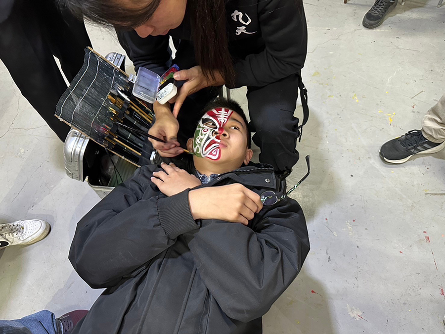 在九天民俗技藝團,活動安排了豐富多元的體驗內容,包括故事導覽、戰鼓實作、神偶尪仔操作,以及官將臉譜彩繪。孩子們在活動中不僅學習了如何敲打陣頭戰鼓,更藉由臉譜的繪製了解各式角色背後的歷史意涵與文化傳承。張家銨也補充,官將臉譜彩繪不僅是技術的展現,更代表著對傳統信仰與倫理價值的尊崇,而神偶尪仔的操作則讓孩子們對陣頭文化與台灣民間故事有了更直觀的感受。