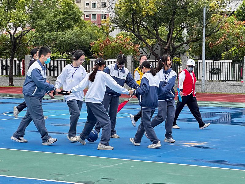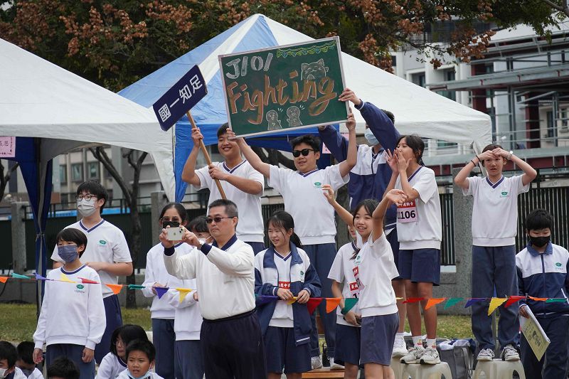 來到運動場中央,班級趣味競賽如火如荼進行著,國中部的項目是「同心協力」,六人一組圍著一顆籃球,直線行走通過角錐後,第二次是要挑戰兩顆籃球,每個班級都卯足全力,勇往直前,過程中還要緊牽著手不能放開,不只是挑戰彼此間的默契,更是培養感情的好時刻。國中組趣味競賽分別由國一知足、國二知足、國三和氣榮獲各年段冠軍。