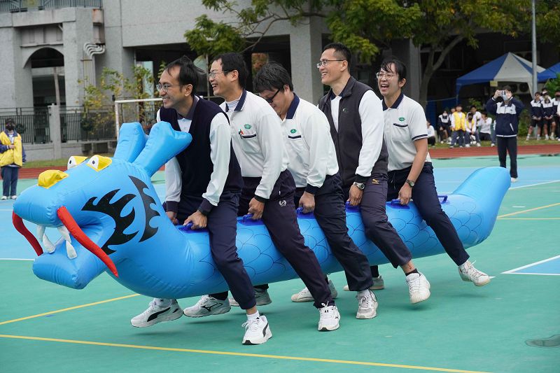而高中部的比賽項目則是「龍的傳人」,充分考驗著參賽團隊的合作默契,每一班都有不同的策略,平時體育課練習的成果就在這時充分展現。當學生組趣味競賽結束後,同學們最期待的教師組緊接著登場,教師和學生一同進行「龍的傳人」PK賽,學生毫不放水,淋漓盡致地展現出隊友之間的合作默契,始終領先在前頭,一旁觀賽的大家看的熱血沸騰,這場賽事得到在場所有人的熱烈歡呼。高中組「龍的傳人」趣味競賽由高一和氣及高二和氣分別榮獲年級冠軍。