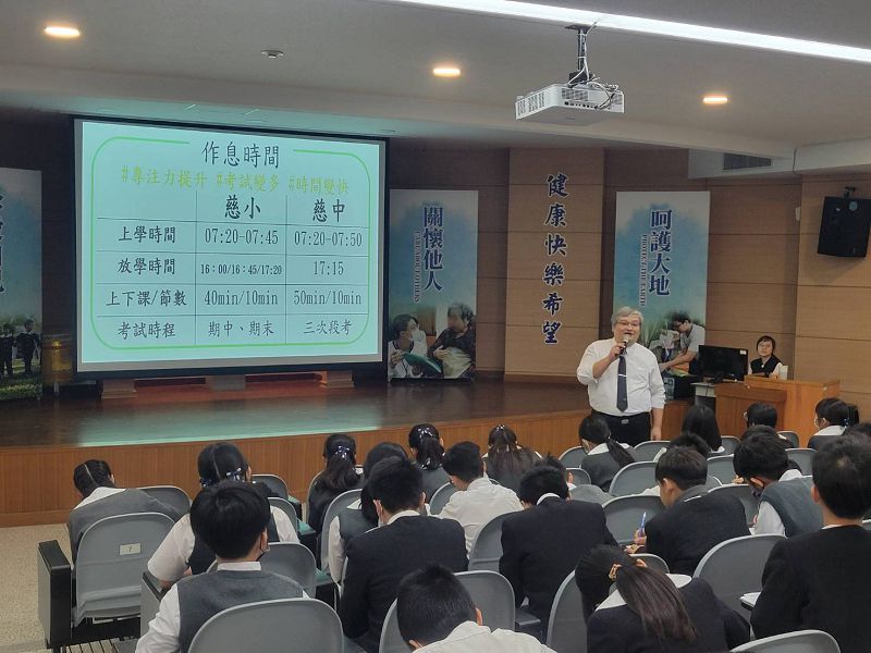 洪振斌主任在講座中詳細說明國中與國小在生活與學習上的差異,讓學生對未來有更清晰的認識。首先,提到上課時間的改變,國中課程與國小相比,上課時間更長,專注力的維持成為一項重要挑戰。此外,學習科目更具多樣性與深度,除了熟悉的國語、數學和英語外,還新增地理、歷史、生物、理化等科目,對學生的學習能力與時間管理有更高的要求,以往記憶背誦已不敷使用,更需要的是上課的理解才能融會貫通。考試次數與壓力的增加也是一大變化,國小階段大部分是二次的考試,國中通常安排三次段考,需要提前好幾週為段考做複習準備,國中會考也將直接影響未來的升學規劃,需要學生更早開始培養複習與自主學習的習慣。