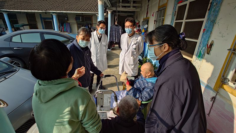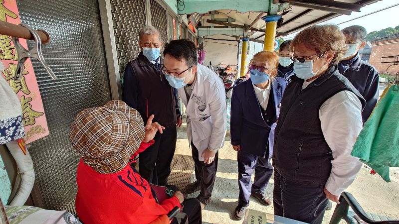 人醫會經過蜿蜒的道路,來到江阿公家,他行動不便,冬日暖陽下,阿公坐在庭院曬太陽吃早餐,醫護人員幫他量血壓,檢視平日所量的數值都偏高,原來是阿公兒子怕藥物副作用,而自行停止服用其中的一顆藥,經由醫護人員耐心衛教解說,按時服藥的重要性,大家也陪伴阿公活動筋骨,以助行器在庭院走路散步。