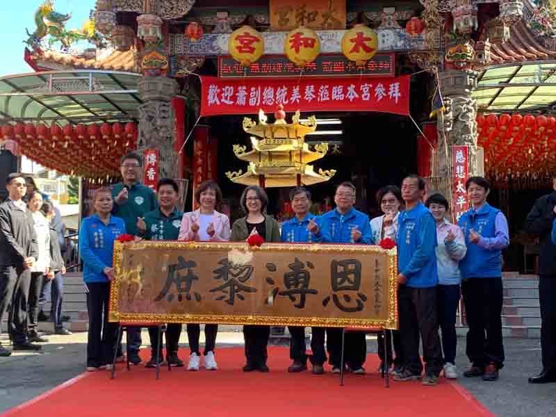 【記者林重鎣台中報導】副總統蕭美琴17日前往台中太平區太和宮祈福,在立委何欣純陪同下,抵達後首和廟方合影後進殿祈福並贈匾「恩溥黎庶」,匾額落款者為前總統蔡英文在卸任前今年三月所贈,適逢520政權交接前國政繁忙,此行由蕭美琴代表贈揭。太和宮主任委員陳啟煌致歡迎詞表示,代表所有信徒歡迎蕭副總統蒞臨,祈求媽祖賜福保佑國家風調雨順國泰民安。
